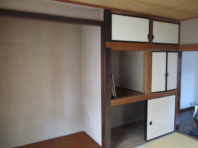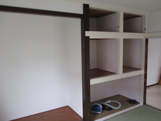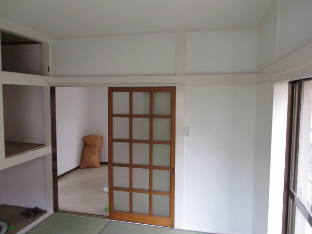 天井についても大きな変更を加えました。元々は溝が一定間隔で入った目透かし天井でしたが、ここもクロス仕上げになりますので、溝はパテで埋めてしまいます。一箇所ずつ丁寧にパテを充填し、サンディングを行うことで、天井一面をフラットな状態に整えます。これにより、洋風のクロスを貼った際に一筋の凹凸も出ない、美しい天井面が実現いたします。また、押入れの壁も塗装致しますので下地処理を致しました。和室独特の木材部分は、吸い込みが激しいため、事前にシーラーを塗布して塗装のノリを良くする手間を惜しみません。