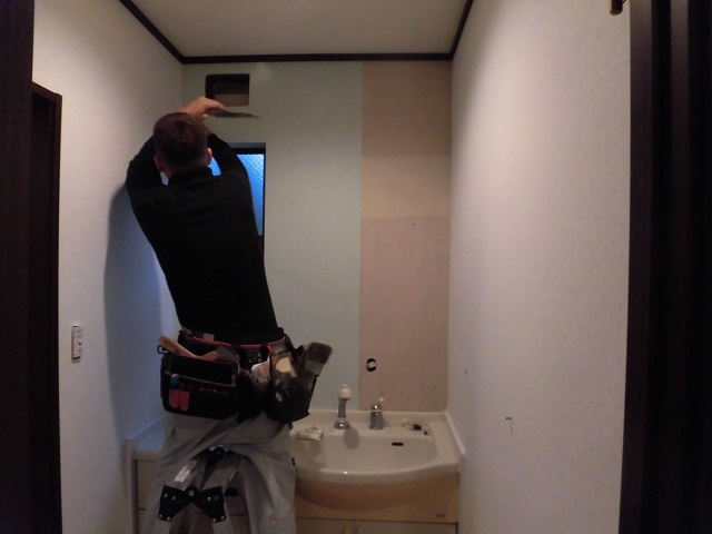 先に取り外せる既存の器具を外してから壁紙を剥がし、職人さんが新しいクロスを張っていきます。