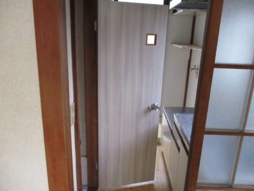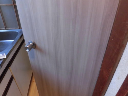 施工後の扉全体です。光を柔らかく反射する木目の質感が、トイレ空間全体の清潔感を底上げしています。既存の枠とも違和感なく馴染んでいます。