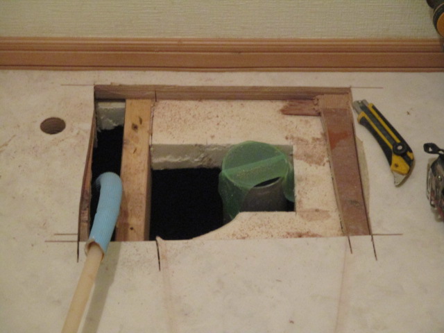 新しい止水栓を床に設置するため、床を開口し配管を動かせるようにします。左側に見えるパイプが既存の給水配管です。