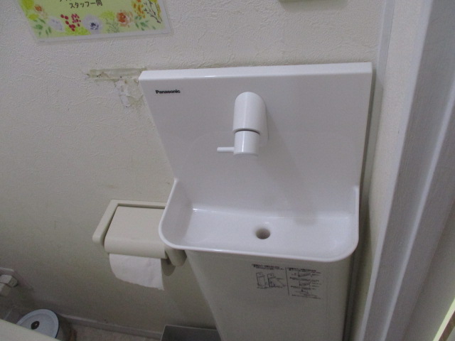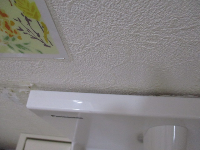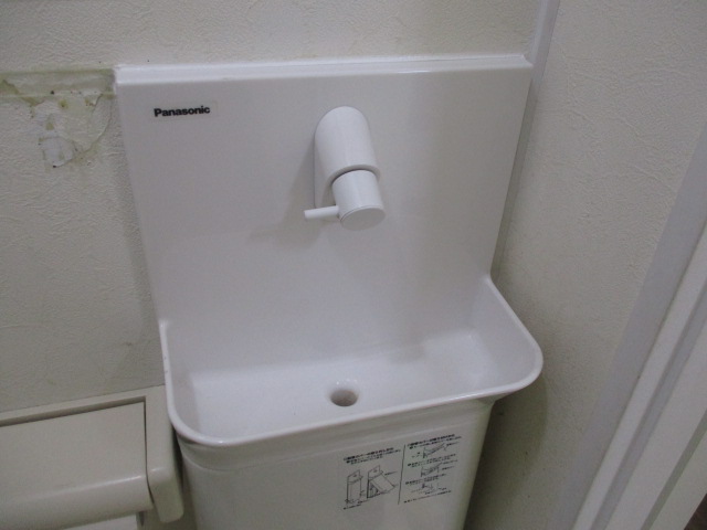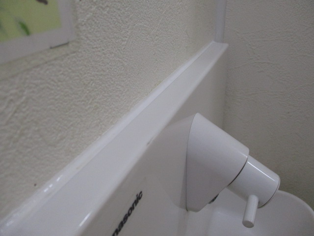 手洗い器の背面と壁のクロスの間に、数ミリメートルの黒い隙間がパックリと開いてしまっているのがはっきりと確認できます。手洗い器は壁にビスで固定されていますが、陶器の微妙な歪みや壁のわずかな凹凸によって、どうしてもこのような隙間が生まれやすくなります。