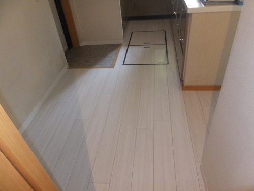 以前もフロアタイルが施工されていましたが、マットな質感で、長年の使用によるくすみが空間全体を少し暗く見せていました。
