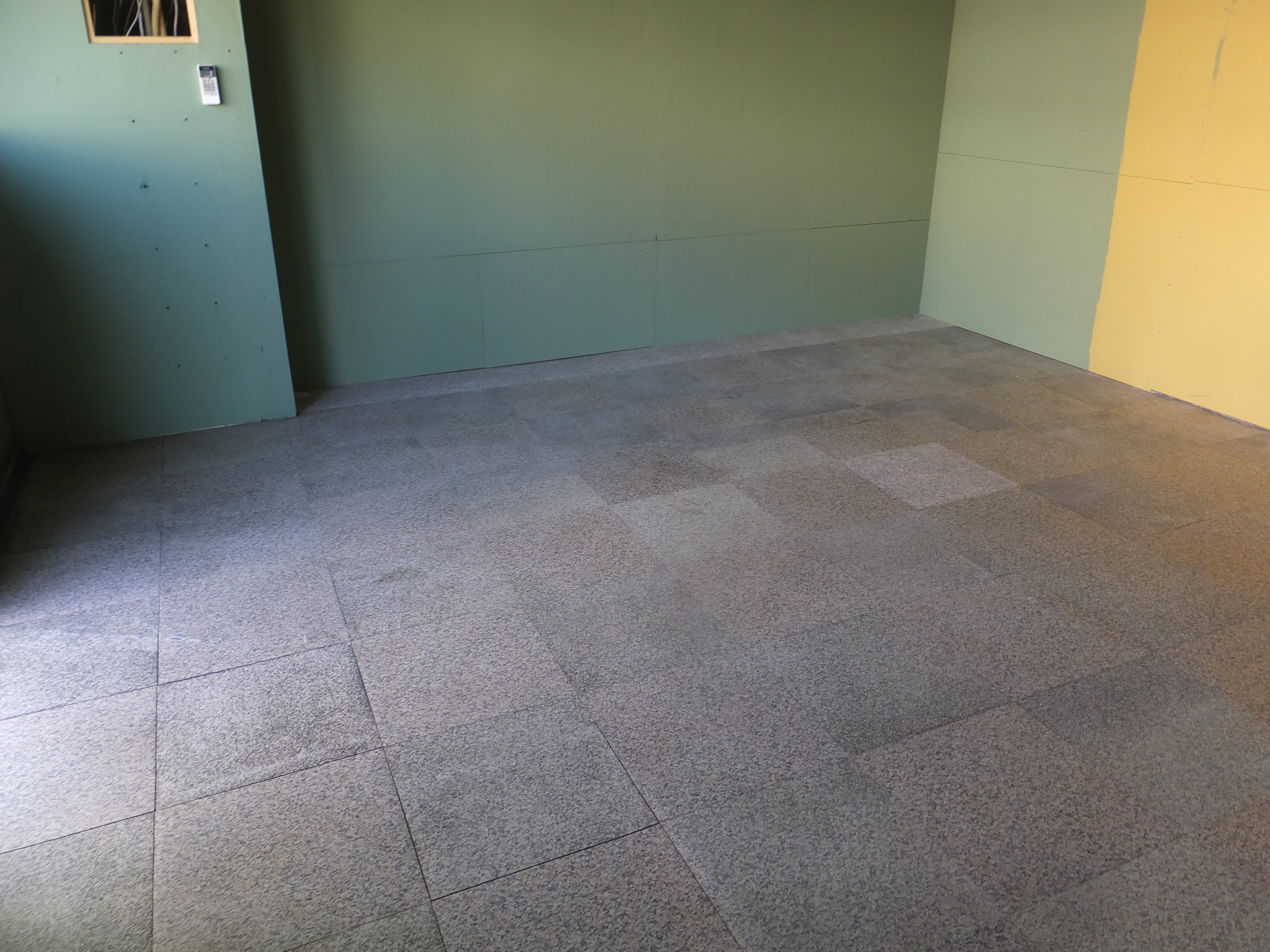 フロアタイルは非常に頑丈ですが、毎日歩行する摩擦によって表面のコーティングがわずかに摩耗し、そこに微細な汚れが入り込むことで、年月とともにどうしても全体のトーンがくすんでしまいます。また、タイルとタイルの継ぎ目部分にも、落としきれない汚れが少しずつ蓄積している状態でした。