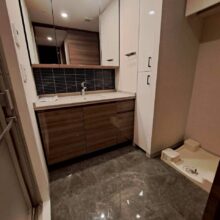 床材を張り替えただけであるにもかかわらず、まるで一流ホテルのパウダールームや、高級レストランの化粧室のような、圧倒的な高級感と清潔感に満ちた空間へと大大変身を遂げました。