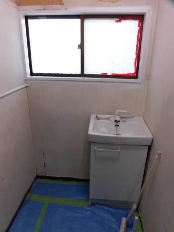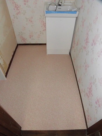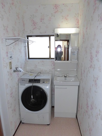 クロス張り、洗面台入れ替え、棚設置完了後です!