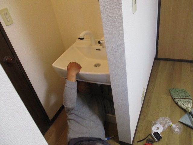 給排水管の接続作業は少し窮屈そうですが、水漏れしない為に慎重に行います!