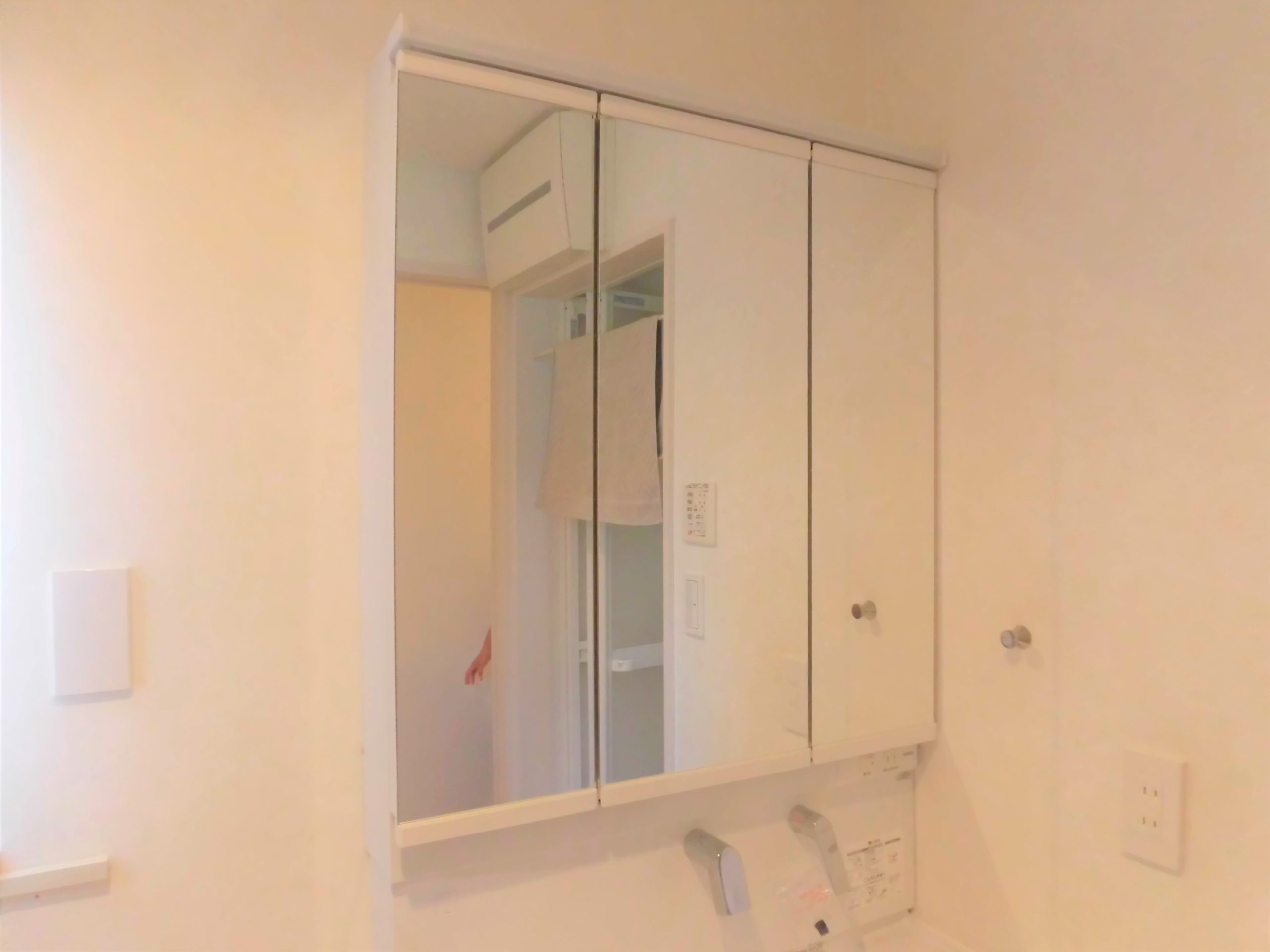 - 三面鏡収納。散らかりがちな小物を隠してスッキリと整理整頓できます。