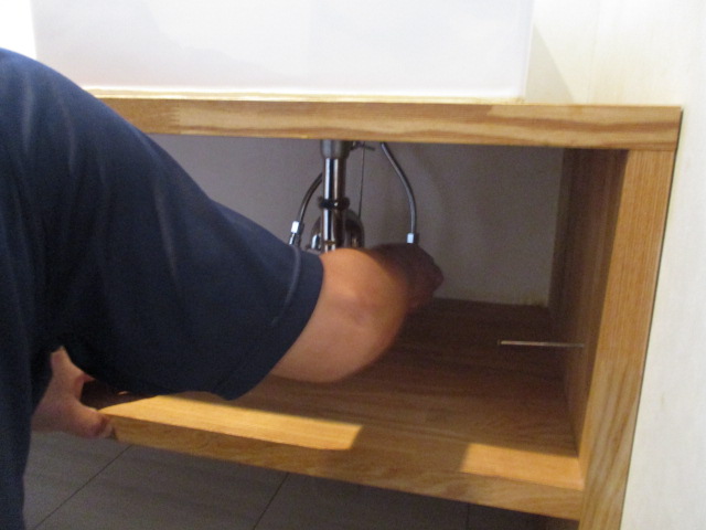 給排水管の位置を引き回しの作業をしていきます。最新の製品に合わせてミリ単位で位置を合わせます。