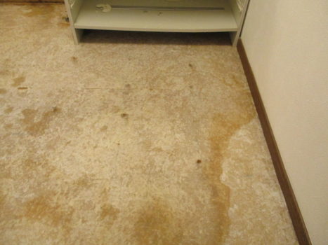 お風呂上がりに水滴が落ちたり洗面台から水が跳ねたりしても染み込むことがないためタオルでサッと拭き取るだけで簡単にお手入れが完了いたします。継ぎ目がほとんどない一枚のシート状で施工されるためタイルの目地やフローリングの隙間のように汚れや黒カビが入り込む余地がありません。普段のお掃除は掃除機やフローリングワイパーでホコリを取り除き汚れが気になる箇所は固く絞った雑巾で水拭きをするだけで十分です。頑固な汚れには中性洗剤を使用し最後に必ず洗剤成分を拭き取ることで長期間にわたって新築時のような美しさを維持することができます。