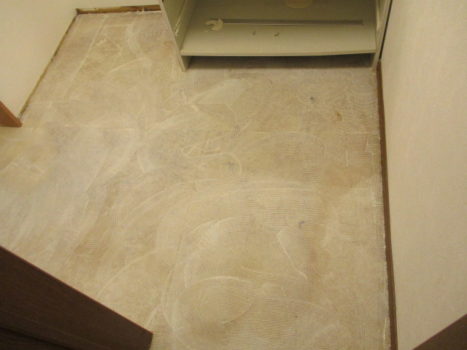 既存の床材を完全に剥がし終え床面に残った古い接着剤やホコリを徹底的に清掃した状態から新しい専用接着剤を均一に広げていきます。