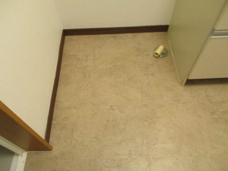 クッションフロアの張替えにおいて新しい床材のデザインや色味と同じくらい重要なのが普段は決して目に見えることのない下地処理の工程です。どれほど高級で美しい床材を選んだとしても土台となる下地が平滑でなければ数ヶ月後には表面に凹凸が浮き出てきたり端のほうから接着剤が剥がれてきたりしてしまいます。既存は剥がし施工途中からの写真になりますが丁寧に作業し接着剤を塗布しております。この段階に至るまでにはいくつもの重要な手順を踏んでいます。