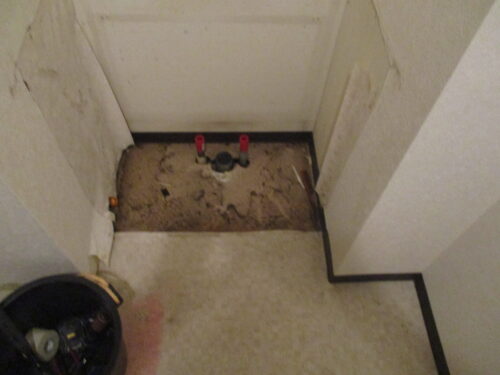 古い洗面化粧台を完全に撤去すると裏側の壁紙や床材の汚れがはっきりと見えてきます。
