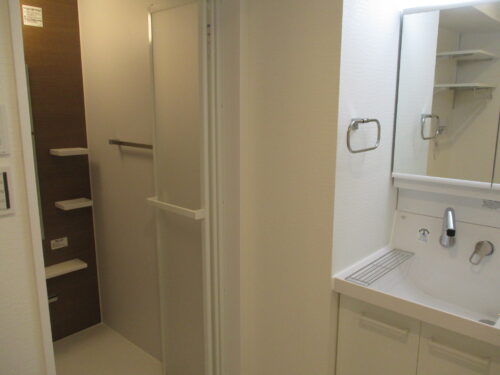 真新しい洗面台が設置され明るく清潔感に溢れる極上の洗面空間が完成いたしました。