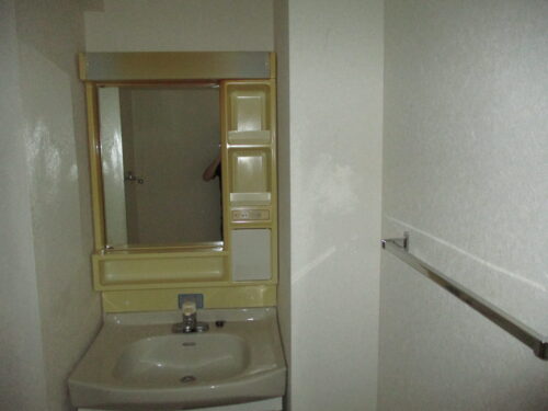 長年の使用により全体的に黄ばみが目立ち薄暗い印象を与える古い洗面化粧台です。