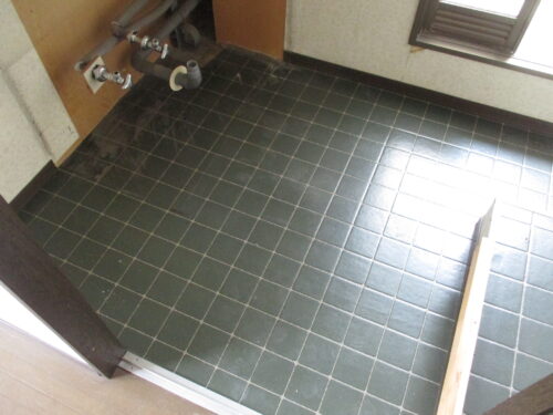 元々は黒いタイル柄のクッションフロアが張られており奥には一段高くなった洗濯機置き場があります。