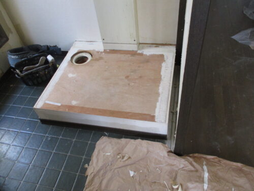 既存の古いクッションフロアをすべて綺麗に剥がし落とし床の土台となっている木材の合板をむき出しにしました。水回りは常に湿気が多くお風呂上がりなどにこぼれた水滴が知らず知らずのうちに床材の端や継ぎ目から裏側へと侵入してしまうことがよくあります。そのため表面のクッションフロアは綺麗に見えていてもそれを剥がしてみると下地の木材が長年の湿気を吸って黒く変色していたり腐って強度が低下し踏むと少しブカブカと沈み込むような状態になっていたりすることが非常に多いのです。