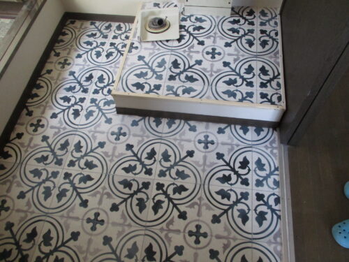 以前の暗く重たい印象の黒いタイル柄から一転して明るく温かみのある見事なテラコッタタイル柄の床へと劇的な変化を遂げました。この柄とっても素敵ですよね。まるでヨーロッパや地中海沿岸の海外のお家みたいで空間の雰囲気がガラッと変わりました。洗面所という生活感が出やすい空間を一気に華やかで特別な場所へと引き上げてくれています。壁紙や洗面台はそのままですが床のデザインが変わるだけでお部屋全体の明るさや広さの感じ方まで全く違って見えるのが内装リフォームの素晴らしいところです。