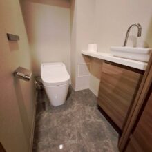 床材を張り替えただけであるにもかかわらず、まるで高級ホテルやゲストハウスのパウダールームのような、圧倒的な清潔感と高級感に満ちた空間へと大大変身を遂げました。